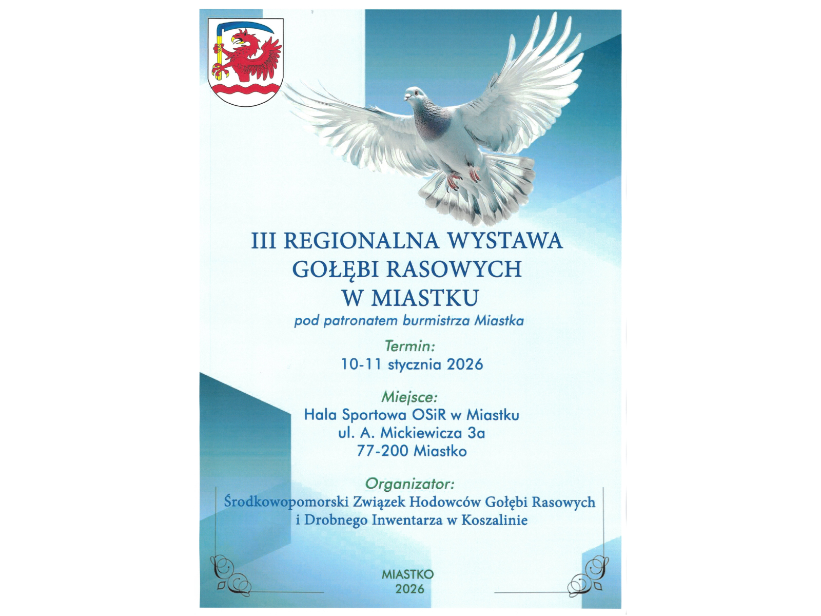 Serdecznie zapraszamy mieszkańców oraz miłośników hodowli na III Regionalną Wystawę Gołębi Rasowych w Miastku, organizowaną pod patronatem Burmistrza Miastka.