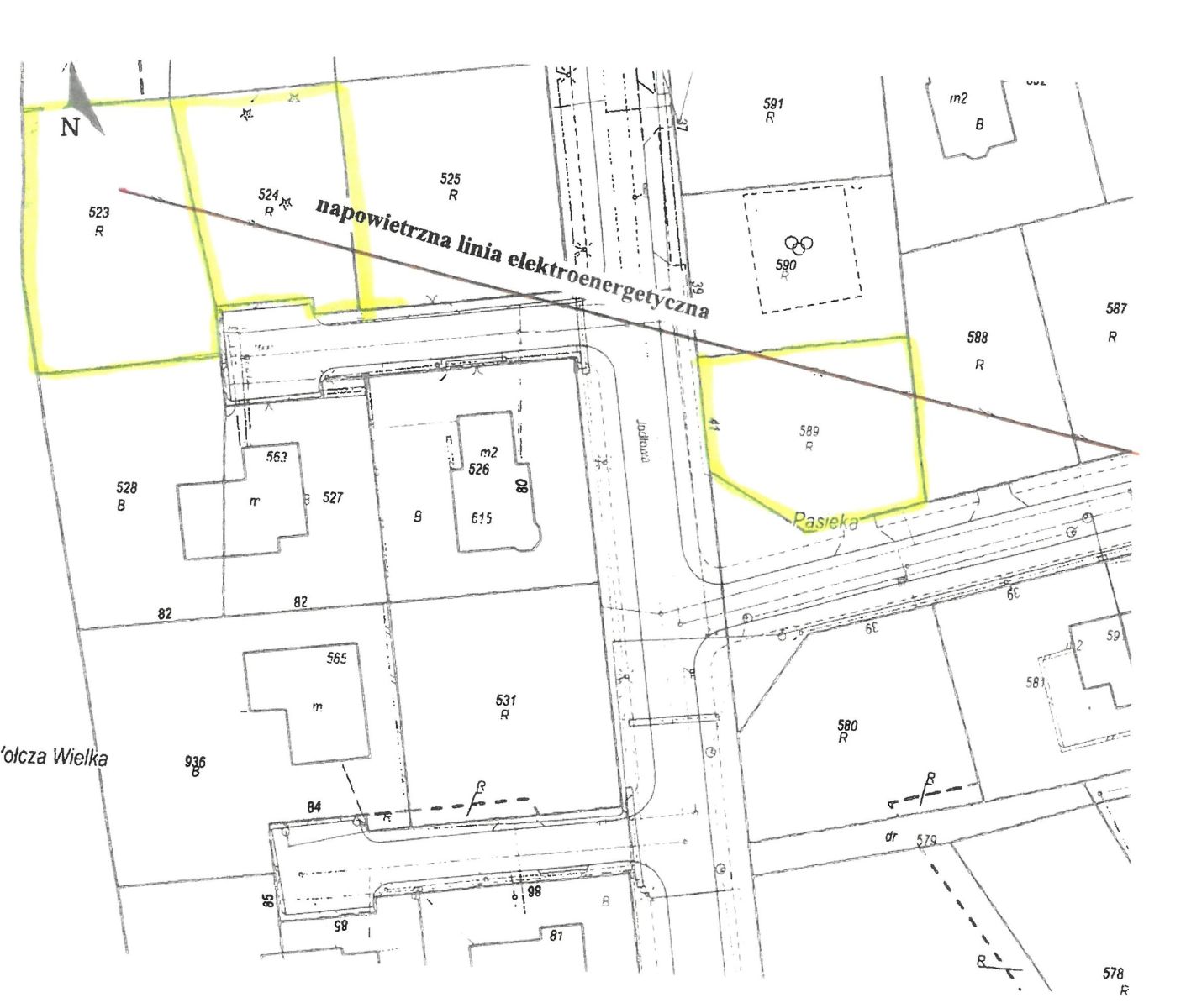 Na działkę numer 523 składają się grunty orne – rola kl. V. Na działce znajduje się słup energetyczny pojedynczy, przez działkę przebiega linia napowietrzna średniego napięcia.