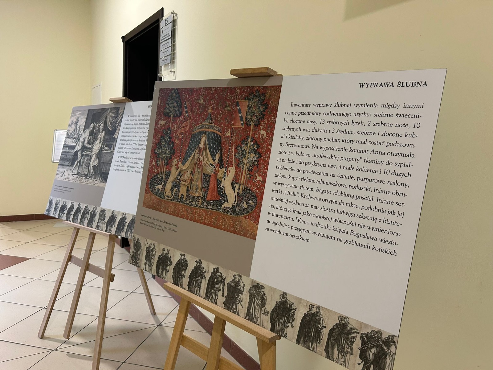 Wystawa prezentuje między innymi dokumenty i informacje dotyczące nadania ziemi rodzinie w Trzebiatkowej w 1515 roku, a także ciekawostki z życia Bogusława X, w tym przygotowania do ślubu z Anną Jagiellonką oraz opisy uroczystości weselnych. Materiały wystawowe zostały udostępnione przez Muzeum Zamku Książąt Pomorskich w Szczecinie dzięki Stowarzyszeniu Dziedzictwa Pomorza im. Bogusława X.