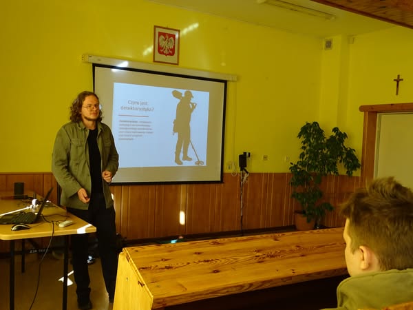Hubert Zając opowiedział o pracy historyka-amatora, poszukiwaniach z użyciem wykrywacza metalu, aspektach prawnych eksploracji oraz zaprezentował wybrane eksponaty ze swojej kolekcji. Uczniowie mogli także zapoznać się z profesjonalnym sprzętem używanym przez pasjonatów historii w terenie.